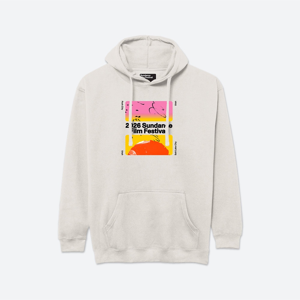 Layer up with this warm hoodie featuring a soft brushed interior, double layer of fleece in the hood, and deep kangaroo pockets. In an oatmeal heather colorway, featuring our vibrant graphic of an abstract orange sun and grainy film strip motif in a pink-and-yellow gradient, this is the perfect statement piece for your winter wardrobe. Sizes: S–3XL Material: 65% cotton, 35% polyester