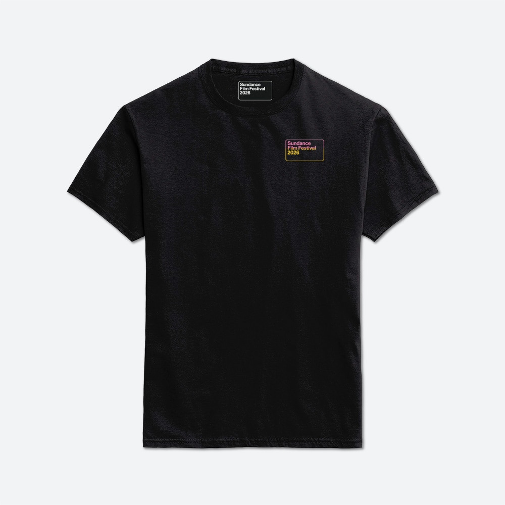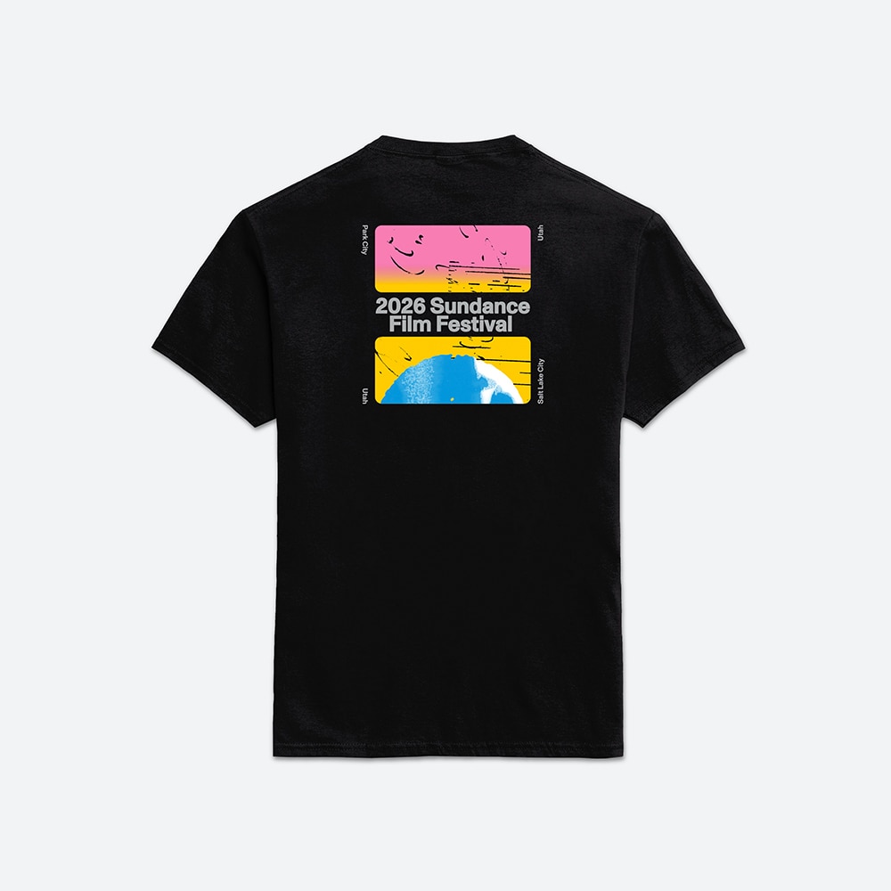 Refresh your T-shirt collection with this relaxed, straight-cut black tee featuring our signature "Sundance Film Festival 2026" logo on the chest and a colorful, abstract graphic of a blue sun and grainy film strip motif in pink-and-yellow gradient on the back. Sizes: S–3XL Material: 100% cotton